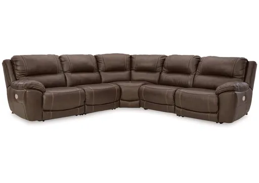 Load up on comfort in a cool, clean-lined and contemporary way with the Dunleith power reclining sectional in chocolate brown. Rest assured, the expertly matched leather and faux leather upholstery is enriched with a pebble grain effect for authentic appeal and enhanced with jumbo stitching for dramatic contrast. It features a one-touch power control with adjustable positions, along with an Easy View™ adjustable headrest that allows a primo view of the TV even when you're reclined. Extended ottomans provide extra length for leg comfort. A zero-draw USB plug-in at your fingertips lets you charge up as you chill out.