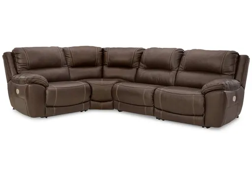 Load up on comfort in a cool, clean-lined and contemporary way with the Dunleith power reclining sectional in chocolate brown. Rest assured, the expertly matched leather and faux leather upholstery is enriched with a pebble grain effect for authentic appeal and enhanced with jumbo stitching for dramatic contrast. It features a one-touch power control with adjustable positions, along with an Easy View™ adjustable headrest that allows a primo view of the TV even when you're reclined. Extended ottomans provide extra length for leg comfort. A zero-draw USB plug-in at your fingertips lets you charge up as you chill out.