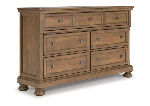 A relaxed take on casual traditional design, this dresser strikes a comfy pose with a classic sensibility. Its timeless design and chestnut brown wood tone create a welcoming retreat tailored to your laid-back lifestyle. Metal knobs in an aged pewter color subtly dress up drawers packed with storage possibilities. A hidden pull-out tray behind the top center drawer keeps your small valuables out of sight.