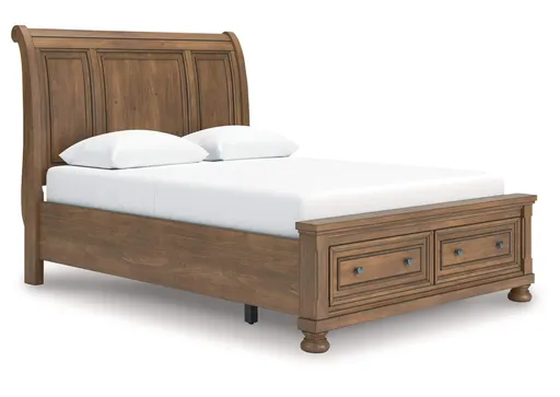 A relaxed take on casual traditional design, this queen storage sleigh bed strikes a comfy pose with a classic sensibility. Its timeless design and chestnut brown wood tone create a welcoming retreat tailored to your laid-back lifestyle. Metal knobs in an aged pewter color subtly dress up footboard drawers packed with storage possibilities. Now there’s a bed with staying power.