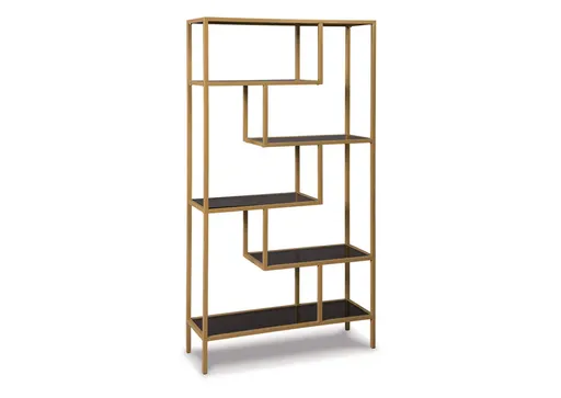 Simple structures make for the coolest designs. The Frankwell bookcase builds on its architectural bias with offset shelves to create a dynamic display in your space. With goldtone finished metal and gray tinted glass, this piece creates a sophisticated and modern silhouette to elevate any urban-inspired space.