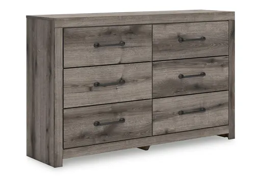 Combining a casual aesthetic with functional flair, this dresser suits styles from rustic to industrial. Its smooth-gliding drawers store everyday essentials with ease, from clothes to bed linens. Elongated drawer pulls in a dark hue polish off the look, harmonizing beautifully with the weathered gray wood grain.
