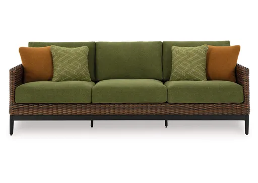 The Horizon Hall outdoor sofa recalls the aesthetics of nature to bring an inviting, high-style feel to your patio or lanai. Its Nuvella+™ performance fabric is made with enhanced UV resistance, so the chic green hue stays brighter for longer. Worried about the weather? Don't sweat it—the durable resin wicker withstands the elements from season to season.
