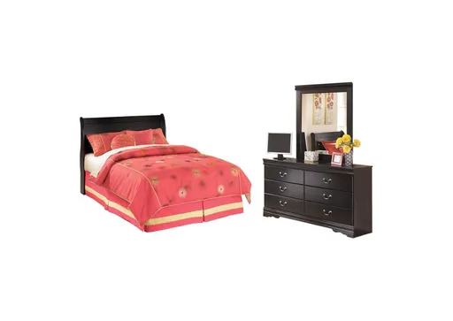 The Huey Vineyard bedroom set with sleigh headboard and dresser/mirror is the epitome of traditional decor. Louis Philippe-style moulding dates back to the mid-19th century when furnishings were lavish yet somewhat simple. Luxe finish adds a slightly modern touch. Smooth-glide drawers beautifully accommodate your wardrobe.