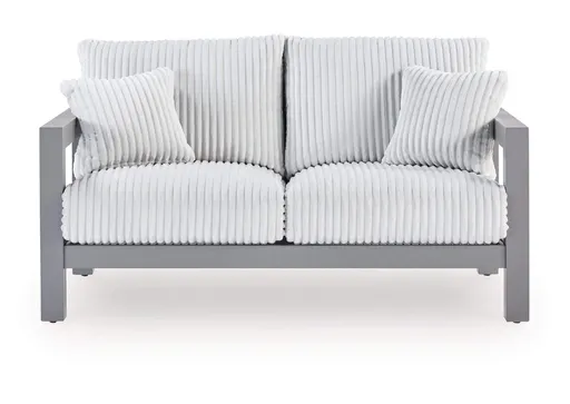 Indulge in luxe outside living without sacrificing longevity. This outdoor loveseat combines on-trend texture with a sleek aluminum frame. Lounge poolside or on the porch—the comfy cushions are a chic spot for you and a partner to soak up the sun. And with cleanable, UV-resistant Nuvella® fabric in a showstopping corded look, style and durability go hand in hand.