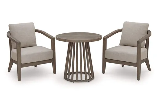 Turn an outdoor space into your own private oasis with this 3-piece cafe set. The essence of easy-breezy outdoor living, the brilliantly styled table and chairs are quality crafted with durable eucalyptus wood. Cushions are wrapped in high-performance Nuvella® fabric, so it's delightfully easy to keep them clean and vibrant. Designed to shed rainwater, the table’s slatted top provides exceptional form and function. This simply chic design brings modern flair to outdoor entertaining.