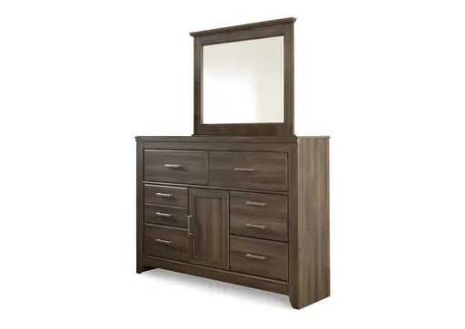 The beauty of vintage design come to life with the aged brown rough sawn finish flowing over a replicated oak grain along with the case pilaster detailing and warm pewter color hardware making the “Juararo” bedroom collection the perfect way to create that cottage getaway within the comfort of your home. Get the look of posh barn wood without setting foot in a salvage yard. Replicated rough-sawn oak of the Juararo dresser and mirror set has a vintage finish that is reminiscent of a timeworn family heirloom. Warm, rustic and naturally beautiful, it’s just got that ageless appeal. Sleek, mod pulls in a pewter tone are a snappy finishing touch.