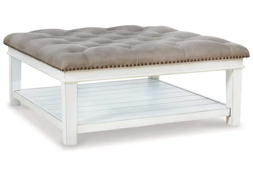 Ideal as a footrest or coffee table stand-in, the Kanwyn ottoman coffee table adds an all-purpose farmhouse touch to your living space. Crafted with comfort and convenience in mind, this square ottoman features a faux leather button tufted seat with nailhead accents. Enhancing its casual appeal, a handy lower shelf houses throws, reading material and other essentials.