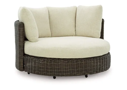 Add luxury, comfort and durability to alfresco fun. The Kimora outdoor swivel lounge chair captures the textural beauty of wicker while withstanding the elements, from rain to shine. With a UV-resistant design, the wonderfully low-maintenance Nuvella+™ fabric maintains its good looks over time. Deep, roomy seating completes the piece, offering ample space to sprawl out.