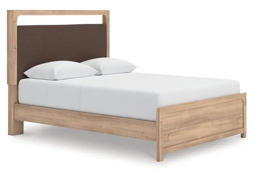 The natural wood tones and clean lines of this queen upholstered platform bed echo your easygoing style sensibilities. With a warm finish and replicated oak grain, its carefree character lightens up your bedroom. Curved inner corner details soften the look, while contrasting brown fabric modernizes the feel. And for added function, warm LED lighting adds serene ambiance at the touch of a button.