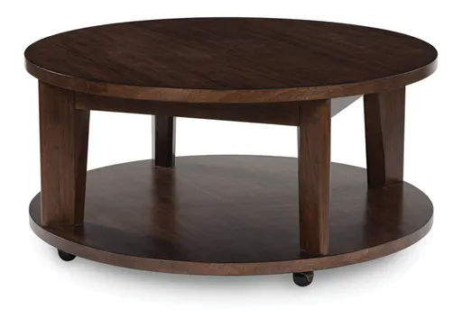 It's hard to say what's most striking about the Korestone 2 round coffee table. Is it the rich warm brown finish or the thick tapered legs? Either way, the table's clean, contemporary aesthetic is perfect for your casual lifestyle. Casters let you roll the coffee table wherever you please … maybe next to your couch or loveseat.