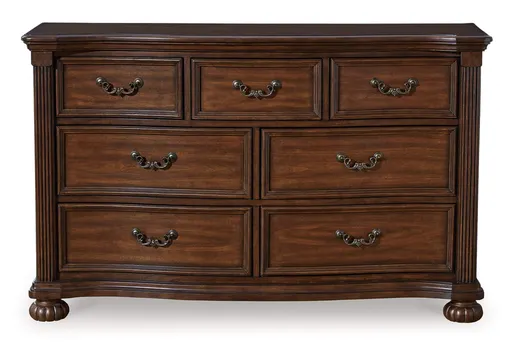 Take inspiration from the traditional luxury of the Lavinton dresser. Classic with a rich cherry brown finish, its stately presence graces your room with an air of opulence. Your taste for exquisite details is satisfied with decorative drawer pulls and chic bun feet. With seven drawers acting as elegant hosts for clothes and other essentials, your restful retreat has never been so refined.