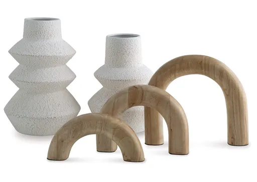 Craft a contemporary haven with the delightfully neutral tones and modern forms of the Maddwarth accessory set. Its sculptures, with their seamlessly streamlined arch designs, can be displayed together or stand solo as subtle statement pieces. The tiered look of the eye-catching vases adds that much more geometric interest.