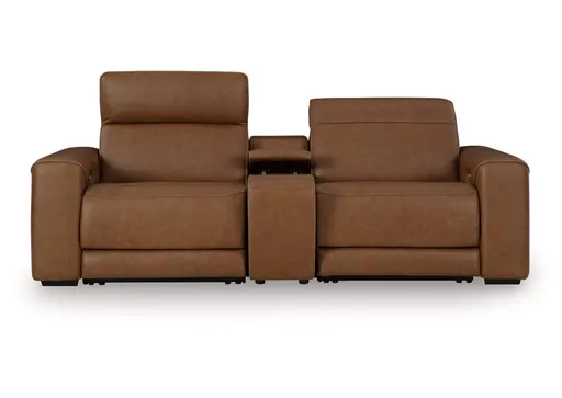 Sleek and streamlined, this contemporary power reclining sectional loveseat with console is ready to sweep you off your feet. Its plush, divinely comfortable cushioning is wrapped in decadently soft leather and faux leather upholstery. The push of a button doubles your relaxation, reclining your body and adjusting your headrest to infinite positions. You can rearrange the sectional's pieces whenever you please, thanks to its versatile modular design. Pop-out cup holders and wireless charging complete the luxurious lounging experience.