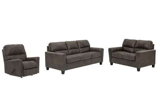 If you love the cool look of leather but long for the warm feel of fabric, you can take comfort in the Navi 3-piece set with sofa, loveseat and recliner. Wrapped in a fabulous faux leather with a weathered hue and hint of pebbly texture to resemble the real deal, this decidedly modern ensemble proves less is more. Elements include angled side profiling and track armrests wrapped with a layer of pillowy softness for that little something extra. Prominent jumbo stitching and clean-lined divided back styling lend fashion-forward flair.