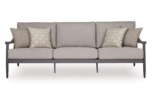 A refined marriage of style and durability, this outdoor sofa adds contemporary flair to your porch or patio. Wood tones and shades of gray lend a versatile, neutral appeal. And this sofa is built to last, thanks to its rust-resistant frame and cleanable, UV-resistant fabric.