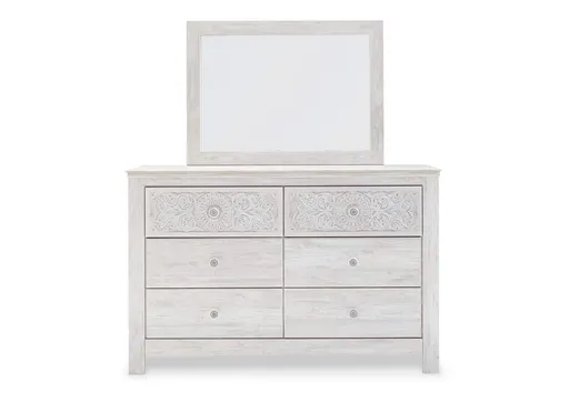 If it’s coastal chic or cottage quaint style you long for, the Paxberry whitewashed dresser and mirror set invites you to go to town. Its distinctive weatherworn finish conveys an easy-breezy sensibility: perfect for a restful bedroom retreat. Tastefully edited lines and medallion drawer pulls give this attractively priced dresser a high-end aesthetic.