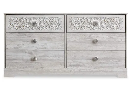 If it's coastal chic or cottage quaint style you long for, the Paxberry whitewashed dresser invites you to go to town. Its distinctive weatherworn finish conveys an easy-breezy sensibility, perfect for a restful bedroom retreat. Tastefully edited lines and medallion drawer pulls give this attractively priced dresser a high-end aesthetic.