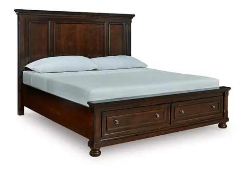 The quality craftsmanship is clear to see. The classic design elements—including bun feet—are easy to love. Satisfying your taste for vintage inspiration, the Porter California king panel storage bed is elegant without looking fussy. Two built-in drawers at the foot of the bed are great for storing linens and throws. Mattress sold separately.