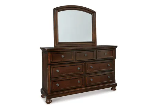The quality craftsmanship is clear to see. The classic design elements—including inlaid panels, antiqued hardware and bun feet—are easy to love. Satisfying your taste for vintage inspiration, the Porter dresser is elegant without looking fussy. Seven roomy drawers keep your wardrobe organized in style, while a hidden pull-out tray puts your small valuables out of sight. The beveled mirror frame beautifully echoes this dresser’s rustic finish.