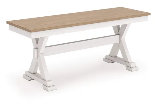 Busy breakfasts and family dinners get a dose of modern farmhouse flair with this dining bench. Its two-tone finish contrasts a light butcher block hue with antiqued white for an utterly charming effect. An effortless seating solution, the bench can tuck under your table to give you extra space to maneuver through the dining room.