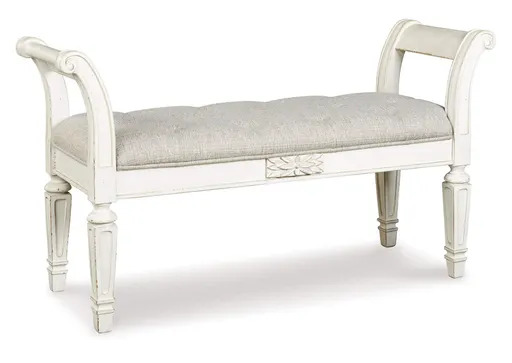 A classic to be cherished for years. The Realyn accent bench is a timeless treasure. Quality wood frame flaunts an antiqued white finish. Touches like the scrolled arms and floral applique give this piece so much character. You’ll love sitting on the cushiony, tufted seat in all of its sophistication.
