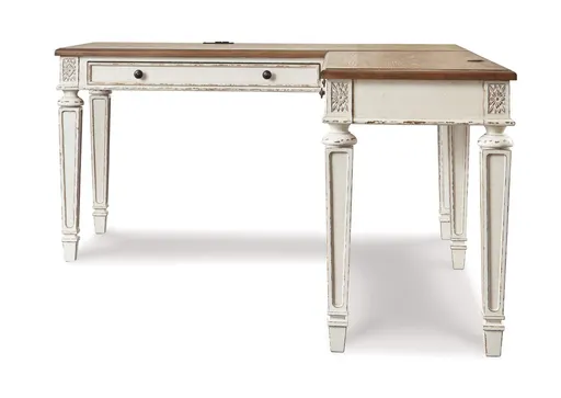 Elevating the art of traditional cottage styling, the Realyn L-shaped desk is your heavenly home office realized. Its two-tone finish combines chipped white with distressed wood tone tops for added charm. Framed drawer fronts, decorative corbels and elegantly turned and tapered legs add refinement, while dark bronze-tone knobs lend a classic touch.