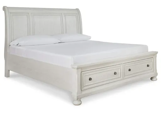 Elegant, timeless furnishings take your bedroom to the next level. Nothing does that better than the Robbinsdale California king sleigh bed with storage footboard. The antiqued white finish with a wonderful grain texture radiates sophistication, while the dark bronze-tone hardware adds a sophisticated touch. Rounding things out, the subtle curve of the headboard keeps the look polished and poised.
