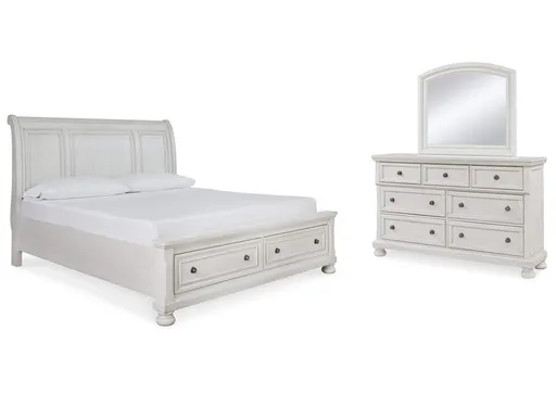 Elegant, timeless furnishings take your bedroom to the next level. Nothing does that better than the Robbinsdale bedroom package. The antiqued white finish with a wonderful grain texture oozes sophistication, while dark bronze-tone hardware adds a sophisticated touch. The dresser's felt-finished top drawers, along with a hidden pull-out tray behind the top middle drawer, round out the set for the ultimate tasteful bedroom.