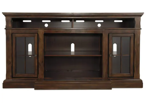 The beauty of the Roddinton TV stand will immediately engage you. The slight breakfront shape is a rare find and an ideal fit among traditional and eclectic tastes. Soft black undertones highlight the warm finish. Multiple cubbies and glass-door enclosed shelves organize your audio/video components and plenty of extras. Sold separately, an electric fireplace fits neatly in the center cubby.