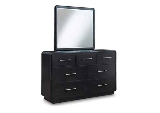 Inspired by art deco design, the softly shaped Rowanbeck dresser with mirror makes a lasting impression in a simply stunning way. Its magnificent curved silhouette is enhanced by a rich layered black finish on the textured wood grain surface. This is the statement piece you’ve been dreaming of to elevate your contemporary inner sanctum.
