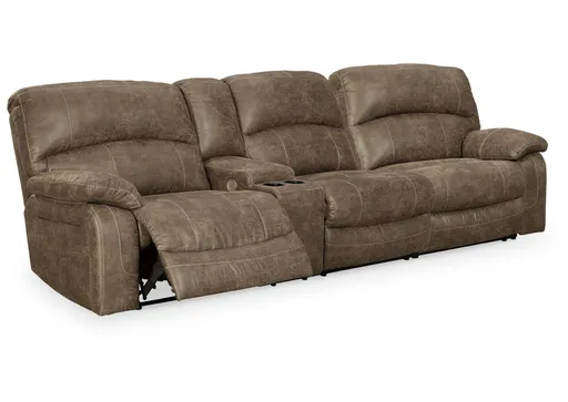 Sporting a driftwood brown faux leather with a gently distressed sense of charm, the Segburg sectional invites you to drift away in high style. Rest assured, the sectional’s leather alternative upholstery offers a warm, cozy feel, while clean-lined styling and jumbo stitching deliver the cool, contemporary look you love. Factor in power reclining motion, USB charging, convenient cup holders and a drop-down table, and you’ve got all the makings for the best seats in the house.