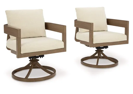 Elevate the appeal of easy-breezy living with the Serene Bay outdoor swivel dining chair. Made to look like wood yet durable enough to weather the elements, it's sure to serve you and your besties well, year after year. The gently curved chair features cushions wrapped in Nuvella+™ high-performance fabric for plush refinement. Go ahead and take a spin.