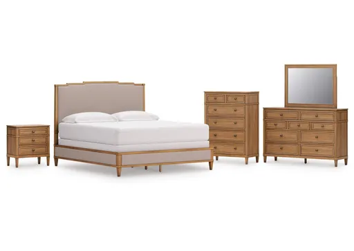Taking a timeless approach to bedroom beauty, the Sharlance bedroom package brings easygoing elegance to the everyday. With its light brown wood tone, it seamlessly slips into your room’s aesthetic. Dark bronze-tone pulls accent the assorted storage drawers, adding to this set's fresh approach to transitional stylings.
