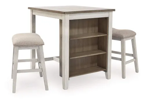 The Skempton counter height table and bar stool set invites you to raise the bar on small space living. An inspired choice for coastal chic or modern farmhouse settings, this clean-lined, simply striking set doubles the charm with brown tone plank effect tops, paired with grayish white bases with rub through effect for timeworn appeal. The table’s built-in open shelves make the most of every inch of space.