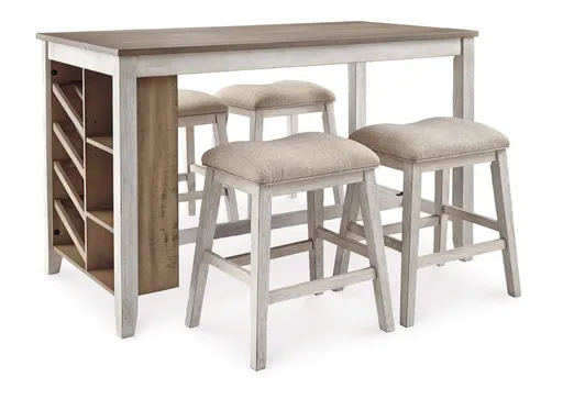 Raise the bar on small space living with the Skempton 5-piece counter-height dining set. An inspired choice for coastal chic or modern farmhouse settings, this strikingly simple table marries a brown tone plank-effect top with a rubbed-through grayish white base for timeworn appeal. The table’s side shelves and 8-bottle wine rack cleverly balance form and function while the comfortably cushioned bar stools serve up high style.