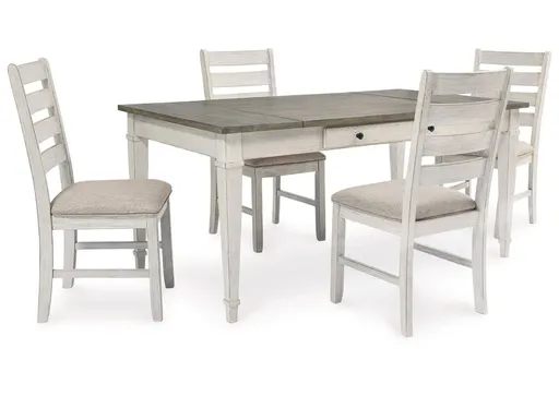 Set the scene for coastal chic or modern farmhouse living with the Skempton 5-piece dining room set. The clean-lined, simply striking table doubles the charm with its warm brown plank-effect top and grayish white base. Two convenient side drawers and a lift-top bin offer abundant storage options. Four upholstered, ladderback chairs sport a grayish white finish with rubbed through effect for a timeworn appeal.