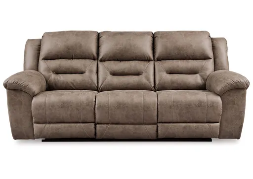 For those who love the cool look of leather but long for the warm feel of fabric, the Stoneland reclining sofa delivers both with ease. Its high-performance padded faux leather is remarkably durable and easy to clean, making it just the thing for family spaces. Channel-stitched back cushions provide indulgent lumbar support for maximum comfort—not to mention fashion-forward flair.