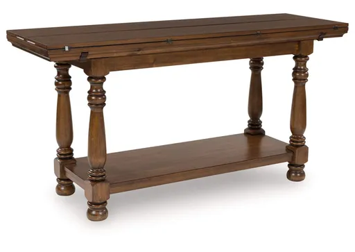 Traditional style doesn’t have to be stuffy. It can feel warm, inviting and beautifully in the moment. Case in point: the Sturlayne flip-top sofa table. Showcasing uniquely detailed leg posts, it has an allure all its own. Equally special is the rich brown finish, which exudes a mood of timeless charm. And when you need an extra dining space, simply fold open the table's hinged panels. How's that for relaxed refinement?