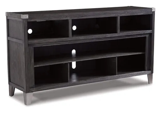 Make watching TV a joy. The Todoe TV stand's rustic-industrial style—with a gray finish, squared edges, zinc-tone corner bracket accents and nailhead detailing—is sure to complement any contemporary decor. Several vented open cubbies offer impressive shelf space, convenient for keeping all of your electronic gear within reach. Handy cutouts keep cords out of sight. The stand's large center opening accommodates a shelving insert (included) or an optional fireplace insert (sold separately).