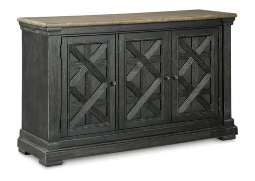 Invite your family into the heart of your home with the Tyler Creek dining room server. Its beautifully textured black finish and timeworn planked oak top create a unique two-tone contrast. A charming lattice design graces the front of the doors. Thick pilasters add to the sturdiness of the foundation. And cabinets offer plenty of storage space for essentials. This is trend-right urban farmhouse style.