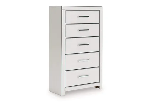 If glitz and glam are your jam, you’re gonna love this chest of drawers. Dazzling chrome-tone touches wow against a sophisticated matte white finish for a pop of stunning pizzazz. And the spacious storage drawers, with large-scale handles and faceted details, don’t disappoint. Loaded with serious sparkle, it's a simply splendid way to wake up your inner sanctum’s style.