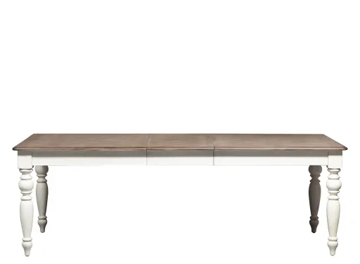 Gather around the Abbey Road Table. Crafted of poplar solids and birch veneers, this piece features a porcelain white finish with Churchill brown tops, one 18” removable leaf to accommodate guests or a larger family, one full extension drawer at each end of the table for additional storage that is accented with antique pewter knob hardware, and is anchored by round turned legs. Abbey Road offers finishes meant to mix and match for an eclectic blending of old and new, cottage and traditional.
