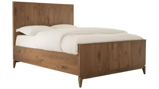 With a simple yet sophisticated profile, Adler Cal King Panel Bed is built from Walnut veneers in a knotty walnut finish. Bronzed brass campaign-style corner brackets and tapered metal legs provide a subtle contrast to the warm tones of the timber for a look that is both fresh and timeless.