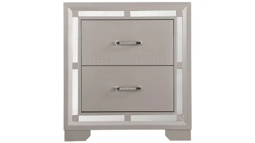 Mirror accents and croc finish are featured on this Alana nightstand. Large scale design and deep drawers add to this piece.