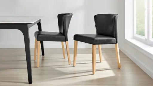 Albie Side Chair is sleek and versatile for different interiors. The smooth Black tone faux leather is also great for daily use and constructed of high-density foam cushion for comfort. Easy Assembly. The leg is solid rubber wood in a natural color finish.