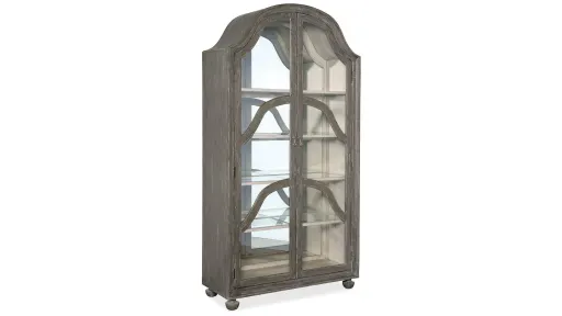Create a functional focal point of casual opulence with the arched-top Costa Display Cabinet that is grand, yet charming and approachable. Finished in a rich and earthy Pottery, or dark gray, color, the Costa Cabinet sparkles with a touch of glam, featuring an antique glass back panel and teardrop pendant hardware with dogwood flower backplates in hand-hammered Florentine gold. Behind the two wood-framed glass doors are four adjustable wood-framed glass shelves, and each shelf has one plate grove. A touch-switch light is on top of the right hinge.
