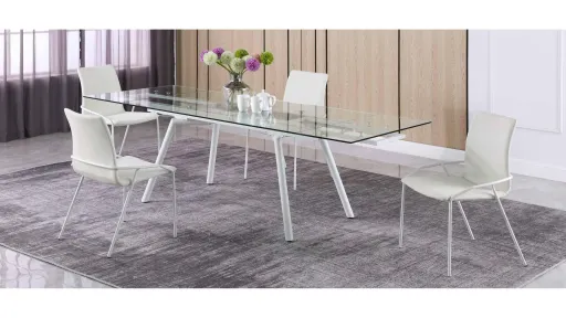 This Alicia dining set features a 35"x 63" table with a clear tempered glass top that extends to 95" and 4 chairs with a white textured faux leather seat and back on a matte white 4-legged metal frame.