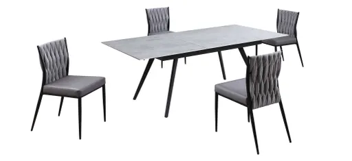 This Amada dining table features a 35"x 63" white marbleized glass top with a pop-up extension. The chairs have a gray faux leather seat and fabric weave back. The set matches in matte black finish to bring your dining set together in a contemporary style dining room.