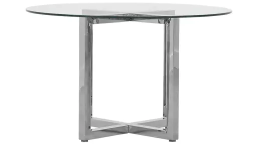 Exceptional from top to bottom, the Amalfi Marble Dining Table features traces of natural veining, ensuring each piece is unique. One-piece metal base is hand-cut and welded from tubular stainless steel for durability and chrome-plated for a mirror finish. Legs are fitted with non-marking nylon glides.